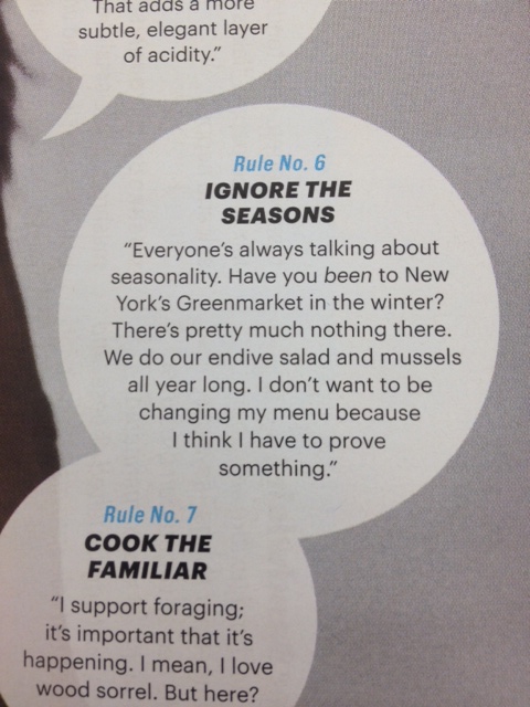 Speaking of Values: I was reading through a popular cooking magazine last night with “10 Best Restaurants” on the cover. I like this stuff…I get a glimpse of where to go while traveling to New York, Seattle, L.A., etc. Also, it’s a great way to see what others are inventing for themselves. To my horror, I read this!