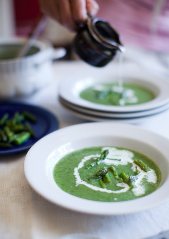 Potato and leek soup with crème fresh, spinach linguini with wild mushrooms, mixed green salad