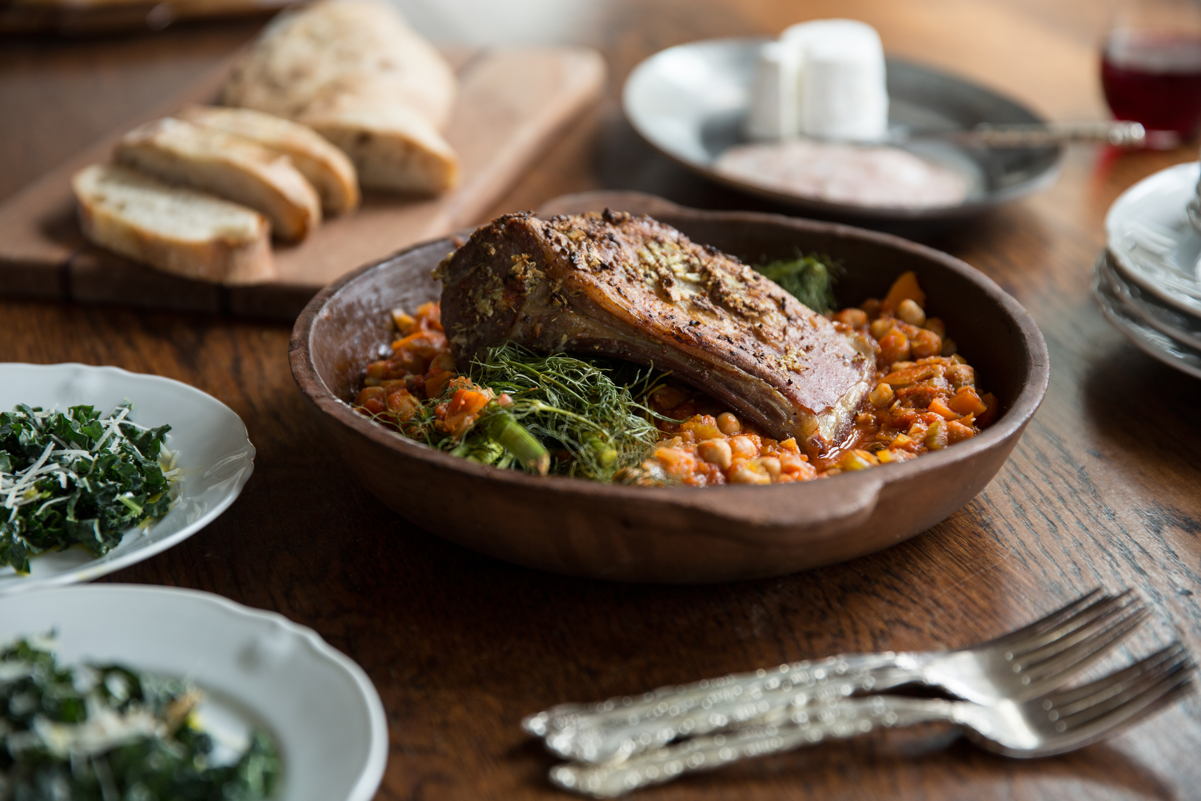 Rack of lamb over a chickpea stew and roasted fennel, kale caesar salad